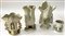 Manifattura francese del secolo XIX, quattro vasetti portafiori in ceramica bianca decorata in rilievo a fiori e figure, misure diverse (difetti)