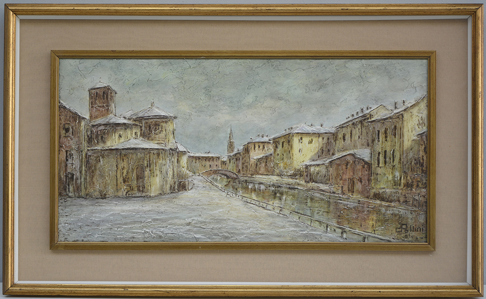 Dario Pollini "Vecchia Milano. Naviglio di S. Marco" Acrilico su tela. Firmato in basso a destra, titolato e firmato al verso. In cornice. (cm 35x70)