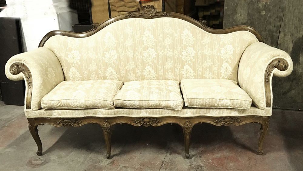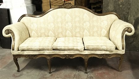 Divano a orecchioni in noce con schienale mosso e intagliato a conchiglia stilizzata e motivi vegetali, fascia, montanti e gambe sagomate ed intagliate, piedini a ricciolo, Lombardia secolo XVIII (difetti)