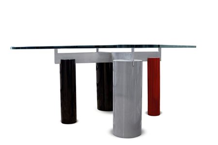 TAVOLO Tavolo con piano in cristallo, base costituita da quattro cilindri in...