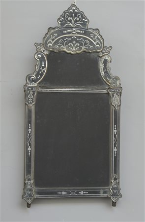 Manifattura del secolo XIX. Specchiera con cimasa di forma sagomata con montanti e fregi a specchi incisi a motivi vegetali (cm 90x46) (difetti)