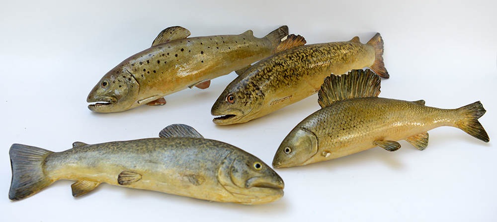 Manifattura inglese. Gruppo di quattro sculture in ceramica policroma raffiguranti pesci (l. cm 50 circa) (gravi difetti)