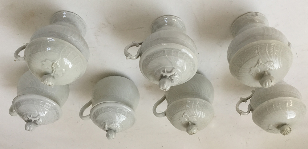 Manifatture diverse. Gruppo di sette cremiere in porcellana bianca (difetti)