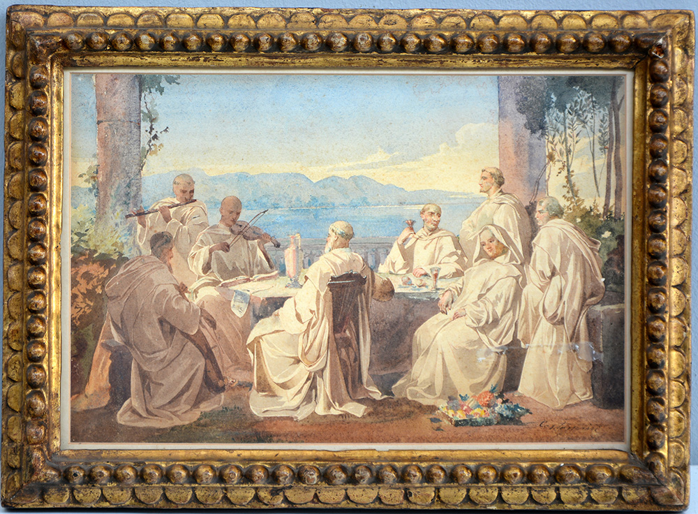 Giuseppe Costantini (Nola 1844 - San Paolo Belsito 1894) "Frati domenicani" '79, acquerelli su carta (cm 20x29) Firmato e datato in basso a destra. In cornice