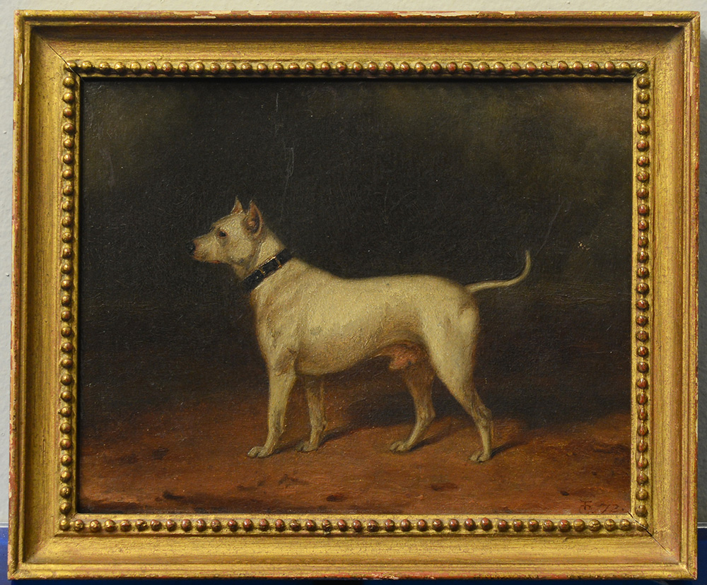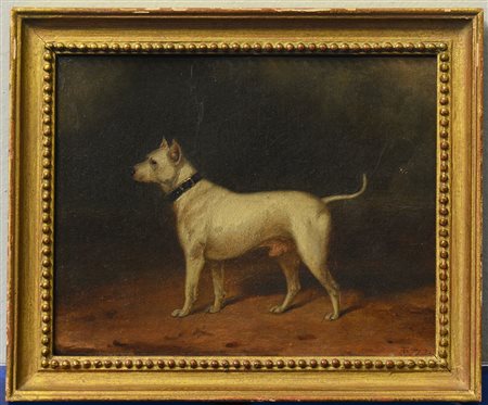Scuola del secolo XIX "Cane in un paesaggio" olio su cartone pressato (cm 15x19) Siglato e datato "TC 72" in basso a destra. Provenienza: Jona Antiques London