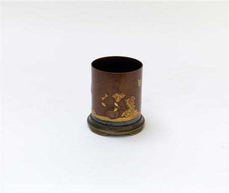 Contenitore cilindrico in rame sbalzato con paesaggio, animali, insetti piante e uccelli. Inizio secolo XX. Marcato incussione "Dudry - E. Duc Lyon". (h cm 11) -EN Contenitore cilindrico in rame sbalzato con paesaggio, animali, insetti piante e uccelli. Inizio secolo XX. Marcato incussione "Dudry - E. Duc Lyon". (h cm 11)