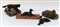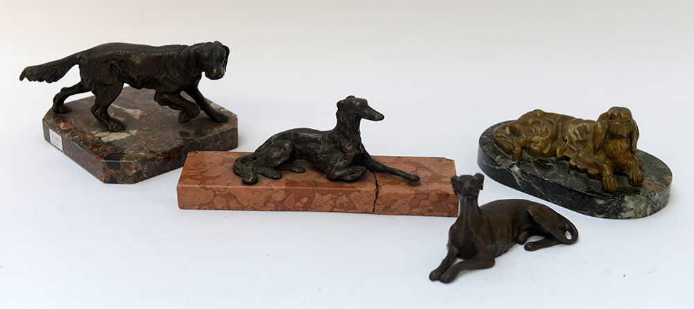 Gruppo di quattro sculture di diverso autore raffiguranti cani, tre con basi in marmo (difetti)