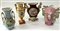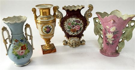 Manifattura francese del secolo XIX, lotto di quattro vasetti portafiori in porcellana decorata in policromia a fiori e fregi dorati, misure diverse (difetti)