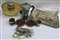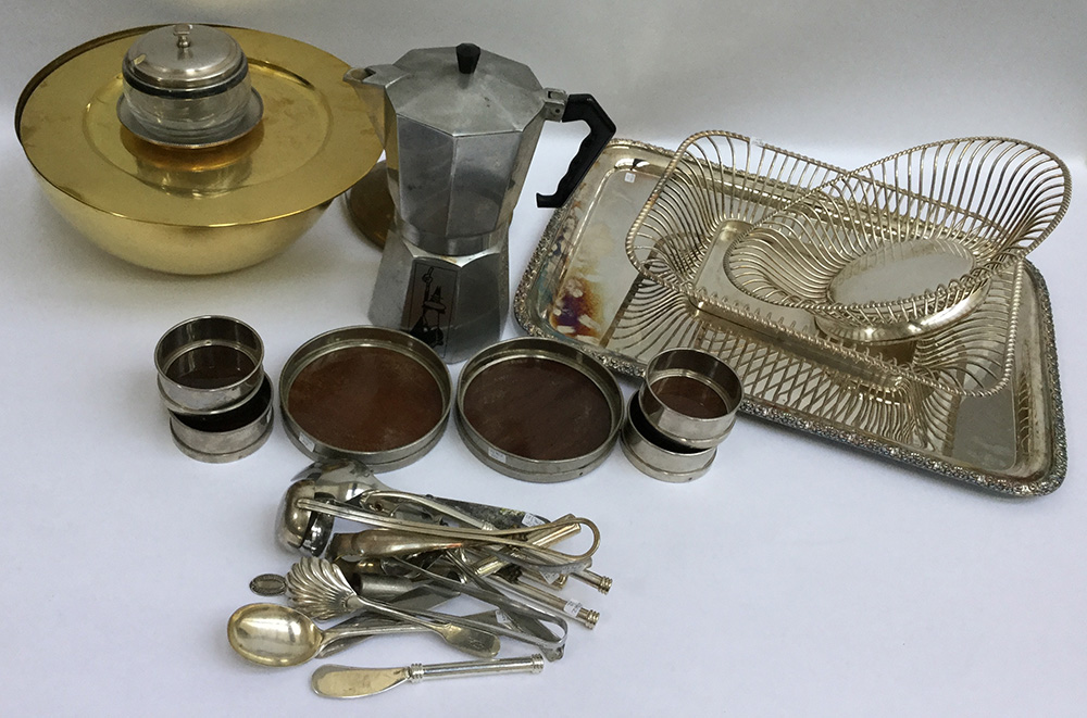 Lotto composto da un vassoio, due cestini, una ciotola, un piatto, un fermaporta, una grande caffettiera Bialetti, due sottobottiglia, quattro sottobicchieri, una formaggera e alcune posate in metallo, metallo argentato e ottone (difetti)