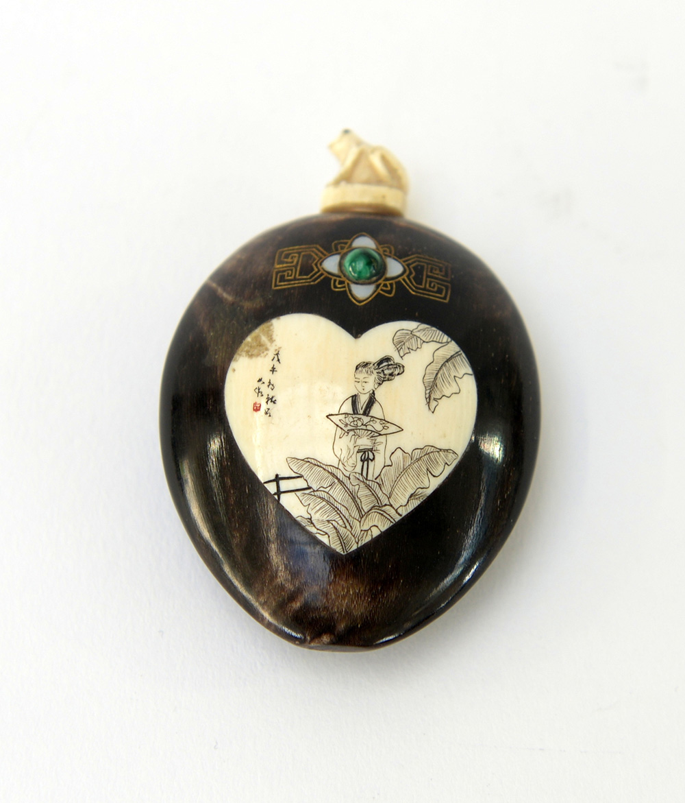 Snuff bottle in corno di bufalo e osso decorata con figure e calligrafia Cina, sec. XX