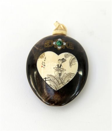 Snuff bottle in corno di bufalo e osso decorata con figure e calligrafia...