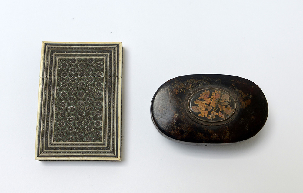 Lotto composto da una tabacchiera in tartaruga e un portabiglietti di fattura orientale. Secolo XIX (difetti)