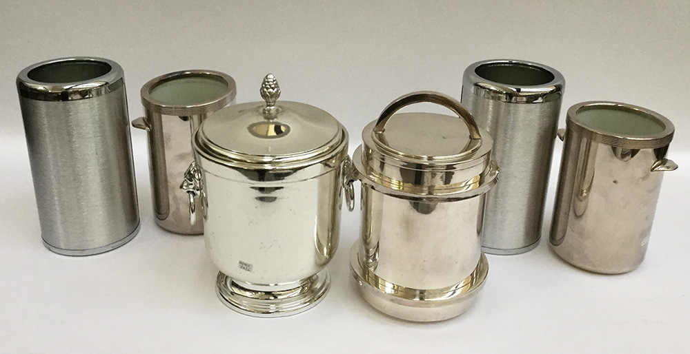Lotto composto da due portaghiaccio e quattro rinfresca bottiglie in metallo argentato (difetti)