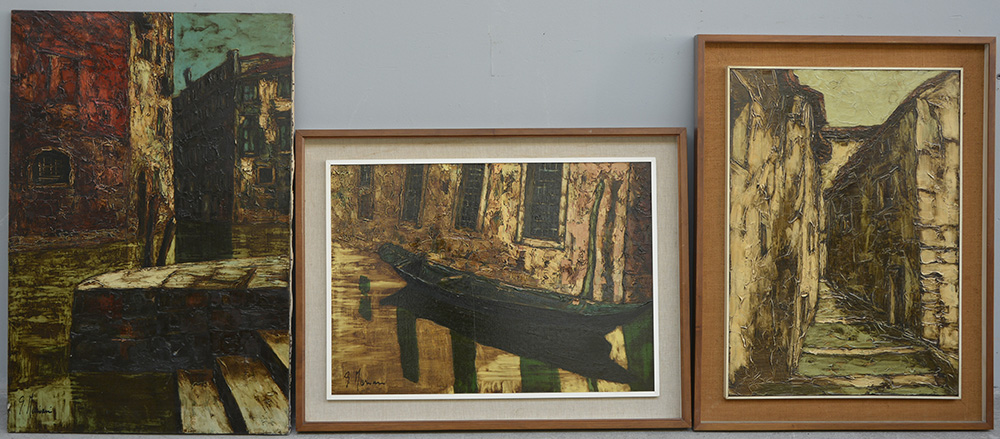 G. Mariani Lotto di tre dipinti ad olio su tela raffiguranti scorci veneziani (cm 50x70 e 90x60) firmati, titolati e datati. Due in cornici (difetti)