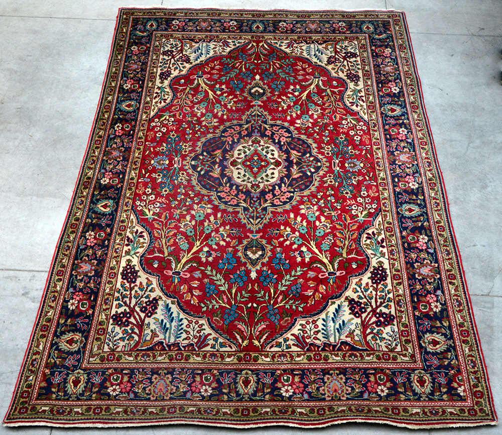 Tappeto Tabriz, fine secolo XX Disegno a medaglione blu con con puntali su fondo rosso (cm 311x214) (difetti)