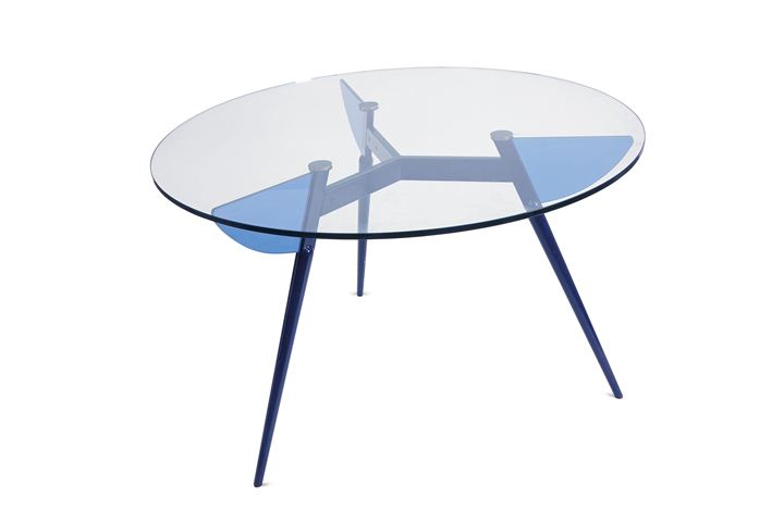 Tavolo rotondo con intelaiatura in metallo laccato blu, piano in cristallo temperato ed elementi decorativi di raccordo in cristallo blu.