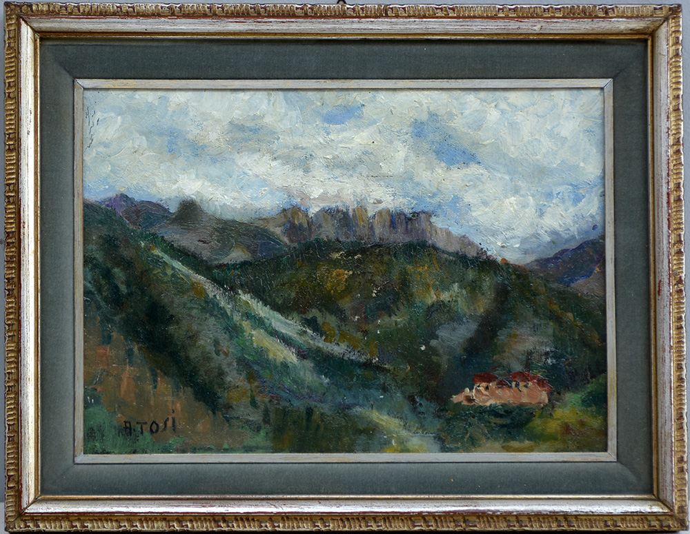 A. Tosi "Paesaggio montano" olio su cartone pressato (cm 22x31) Firmato in basso a sinistra. In cornice