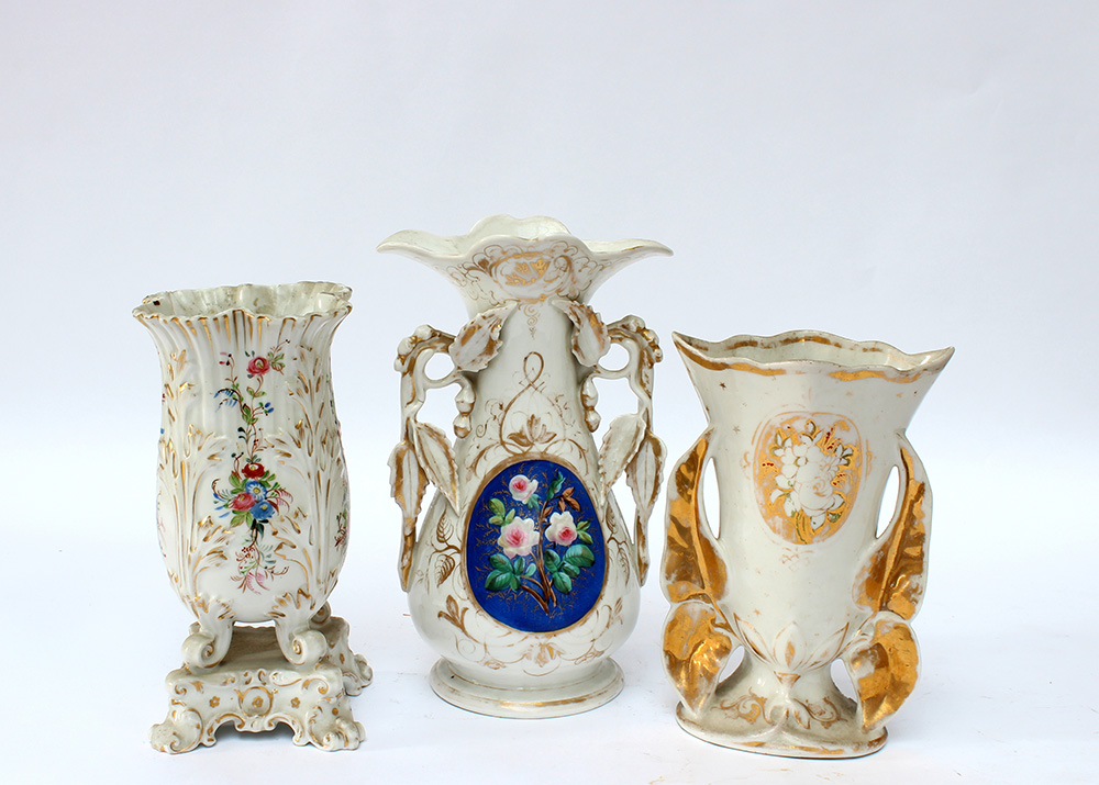 Manifattura francese del secolo XIX, lotto di tre vasetti portafiori in porcellana decorata in policromia a fiori e fregi dorati, misure diverse (difetti)