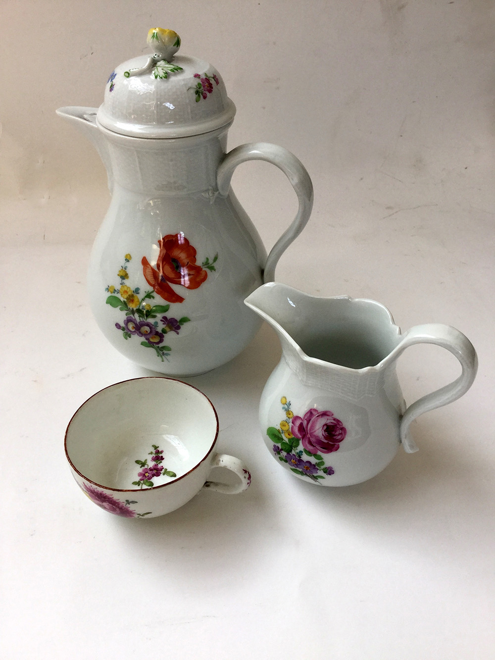 Manifattura di Meissen secolo XX. Lotto composto da una teiera, una lattiera e una tazzina in porcellana a decoro floreale (lievi difetti)