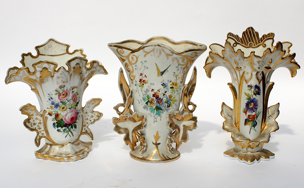 Manifattura francese del secolo XIX, lotto di tre vasetti portafiori in porcellana decorata in policromia a fiori e fregi dorati, misure diverse (difetti)