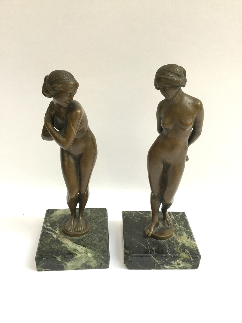 Coppia di sculturine in bronzo raffiguranti nudi femminili su basi in marmo. Primi decenni del secolo XX (h tot cm 20) (difetti e restauri al marmo)