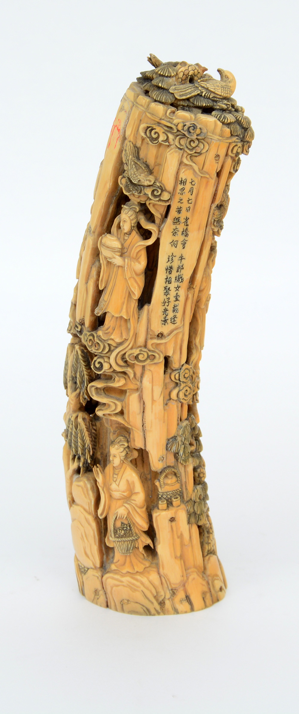 Gruppo in avorio raffigurante dame dalle lunghe vesti in paesaggio (difetti) Cina, sec. XX montano (h. 32 cm.) -EN .
