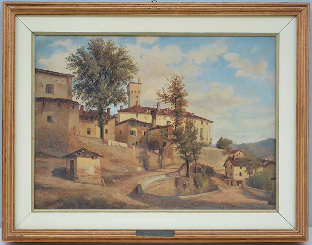 Ignoto, "Scorcio di paese con castello" olio su cartone telato (cm 27x37) in cornice (lievi difetti)