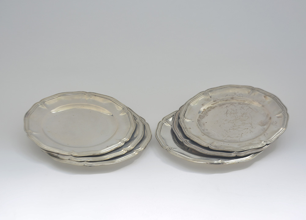 Gruppo di sei piatti con bordo sagomato in argento liscio (gr. 1400)
