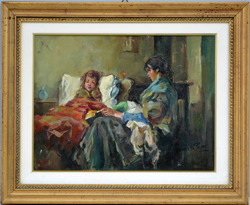 Concetta Pane "L'ammalata" olio su compensato (cm 30x40) firmato in basso a destra, in cornice (difetti)