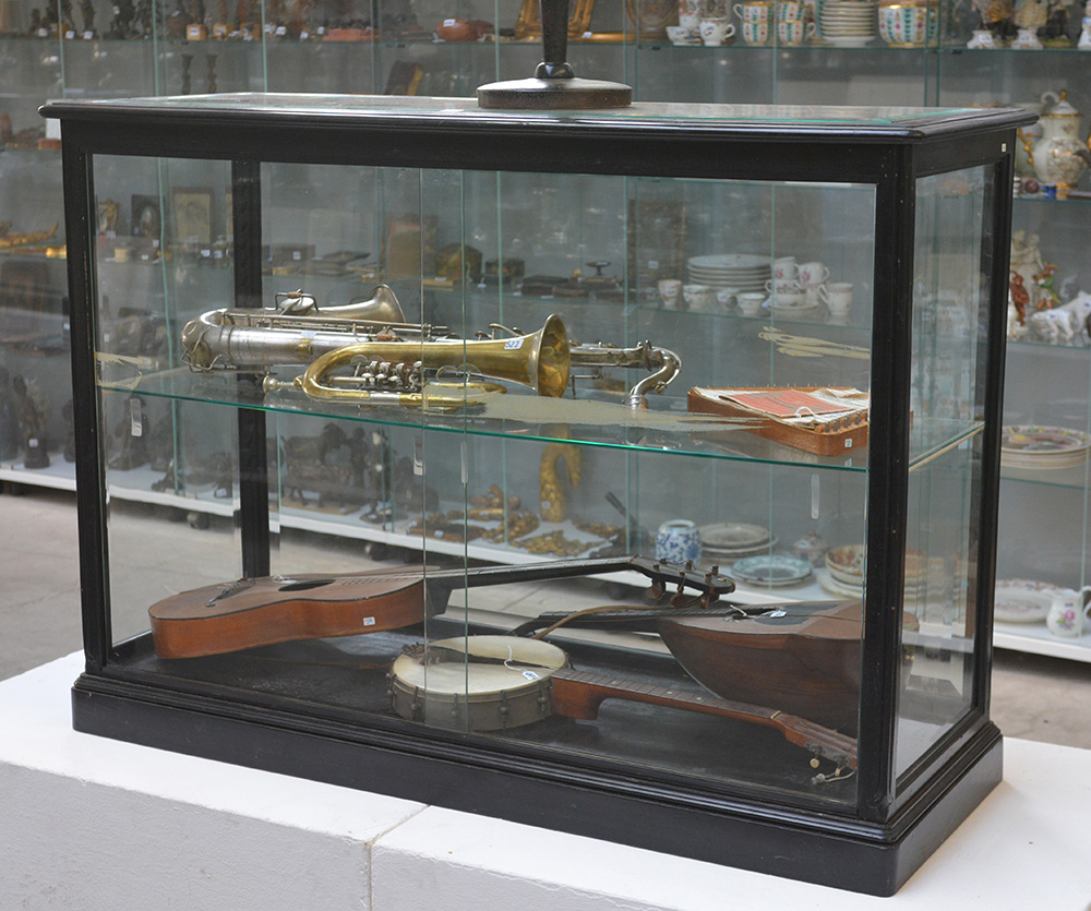 Vetrina bassa da centro in legno ebanizzato con due ante a vetri scorrevoli, fine del secolo XIX (cm 127x98x50)(difetti)