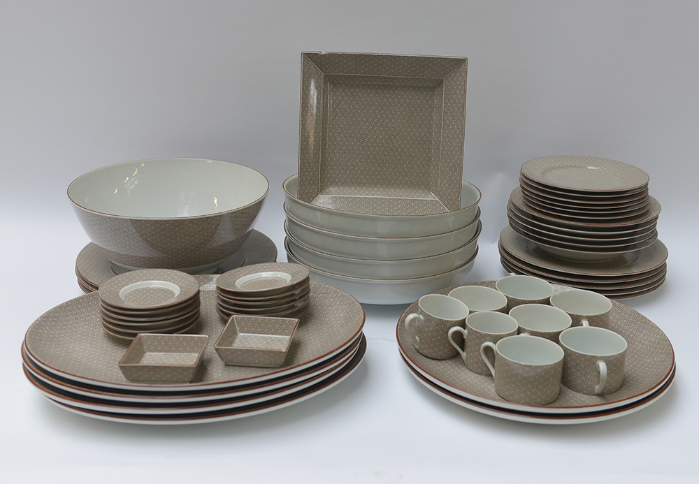 Parte di servizio di piatti e tazzine in porcellana decorata a motivi...