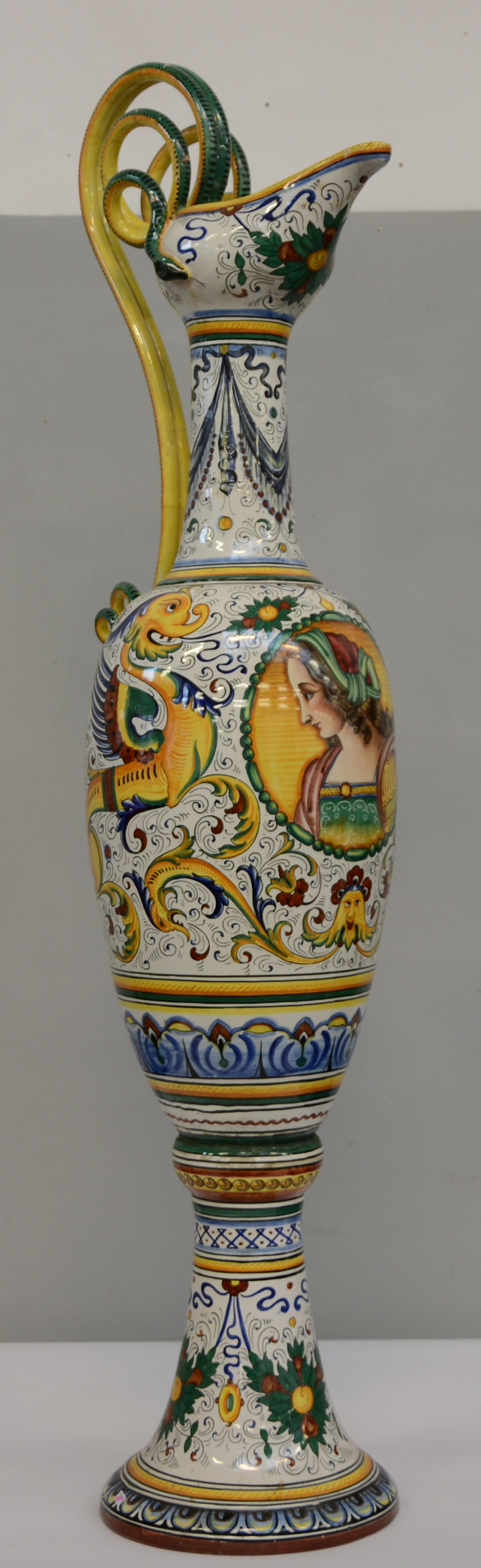 Manifattura di Deruta - P. Menotto - E. Moschini, grande versatoio biansato in ceramica decorata in policromia con volto, animali fantastici e motivi vegetali. Prese a forma di serpenti (h cm 130) (difetti e restauri)