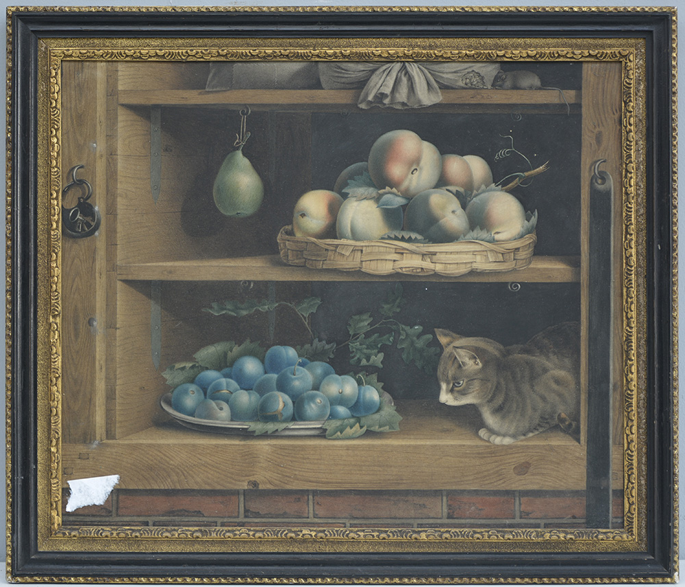 Scuola francese del secolo XIX "Trompe l'oeil raffigurante frutto e gatto in uno scaffale" tecnica mista su carta (cm 50x62) firmato e datato in basso a sinistra "Chev.r De Barde fecit 1799"