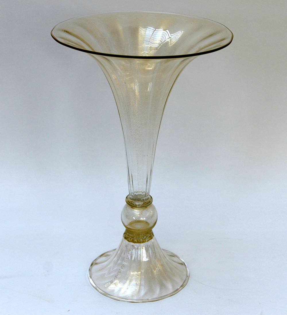 Vaso strombato in vetro incolore costolato con applicazioni di foglia d'oro. Secolo XX. (h cm 35) -EN Vaso strombato in vetro incolore costolato con applicazioni di foglia d'oro. Secolo XX. (h cm 35)