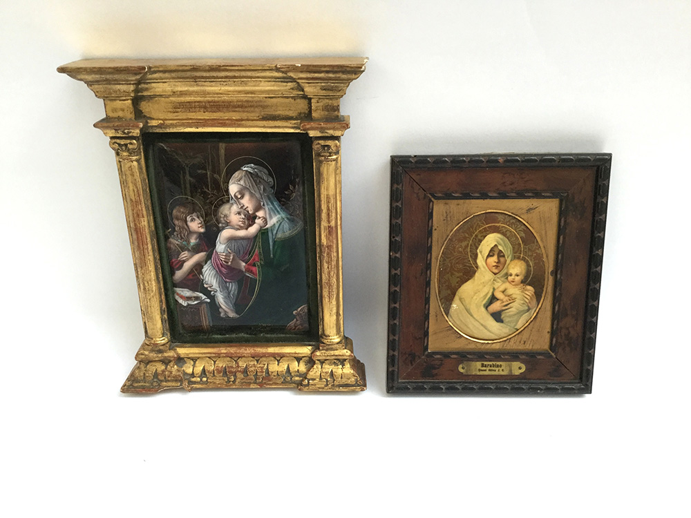 Lotto composto da due placche decorative riproducenti Maternità, una in ceramica, in cornici (lievi difetti)