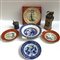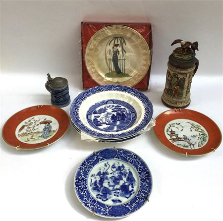 Lotto composto da due boccali e sette piatti decorativi di differenti fatture di cui sei a decoro orientale (lievi difetti)