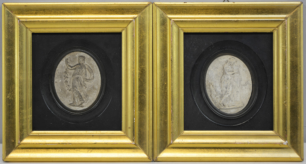 Coppia di bassorilievi ovali in gesso con figure femminili neoclassiche (cm 7,5x9,5). Secolo XIX, in cornici (difetti)