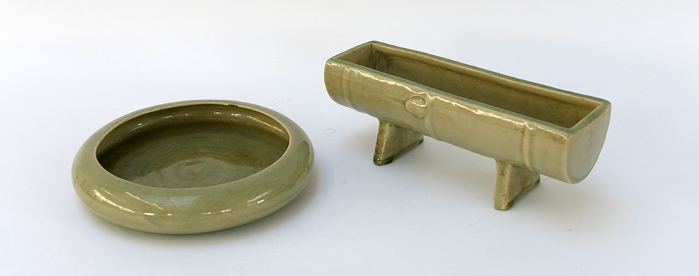 Manifattura orientale. Lotto composto da due vasi di forma diversa in terracotta smaltata verde (difetti)