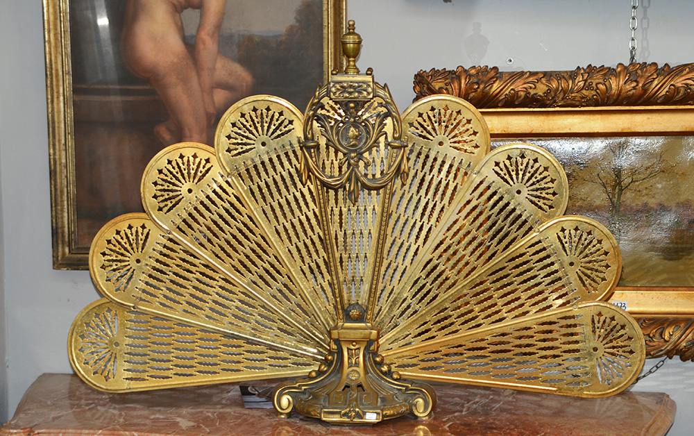 Parascintille a ventaglio in metallo dorato. (h cm 66) (lievi difetti) -EN Parascintille a ventaglio in metallo dorato. (h cm 66) (lievi difetti)