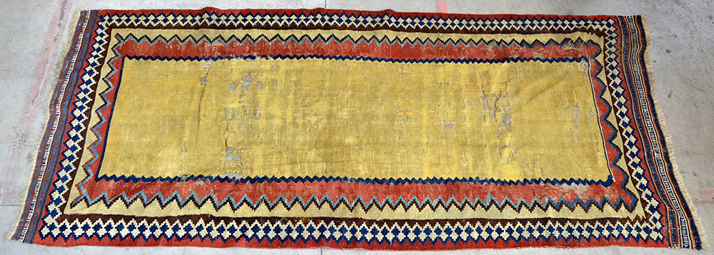 Tappeto Kilim, Qashqai fine secolo XIX Campo tinta unita giallo e bordura a Medacyl (cm 298x134) (gravi difetti)