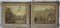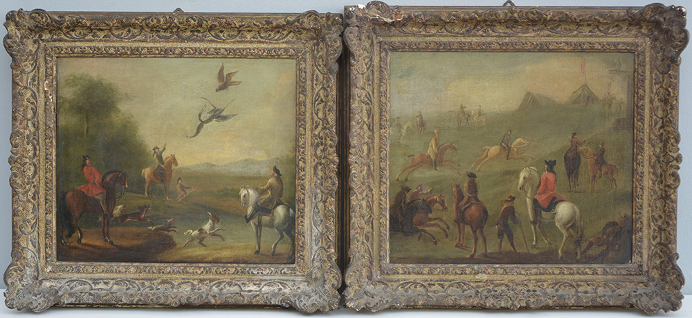 Scuola inglese forse del secolo XVIII "Scena di caccia con il falcone e corsa coi cavalli" coppia di dipinti ad olio su tela (cm 30x34) al retro etichetta di provenienza "The Cooling Galleries, London" in cornici (difetti e restauri)