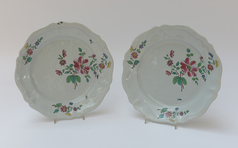 Coppia di piatti decoro floreale (d cm 29,5) seconda metà del secolo XVIII (difetti)