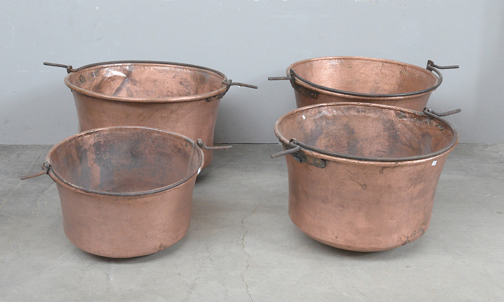 Lotto composto da quattro antichi grandi paioli in rame con manici in ferro di misure diverse (d max cm 80) (difetti)