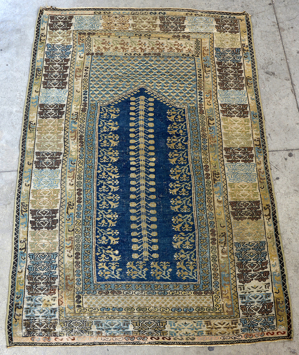Tappeto Kirsheir, Anatolia prima metà secolo XIX Disegno a preghiera con Mirab blu decorato con gigli e albero della vita (cm 184x121) (difetti e vecchi restauri)
