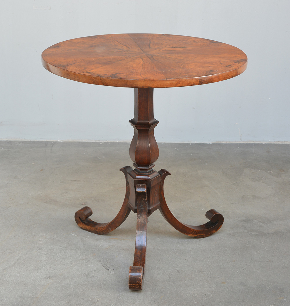 Tavolino tondo lastronato in noce con gamba centrale a colonna terminante a piedi sagomate. Secolo XIX (d. cm 70x h. cm 76) (difetti)