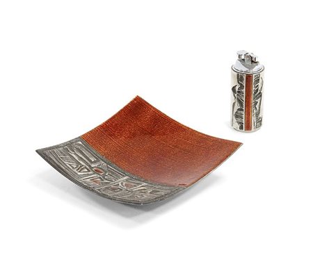 Accendino in metallo cromato e centrotavola in metallo argentato, parti in smalto.