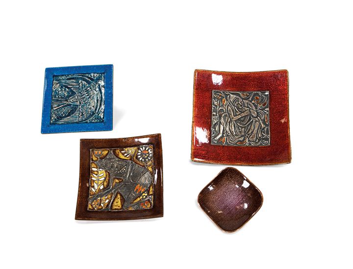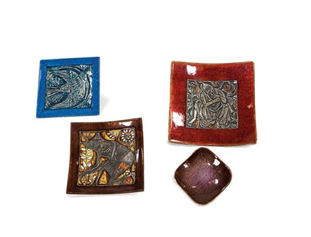 STUDIO DEL CAMPO Tre piatti decorativi ed una ciotola in smalto su lastra di...