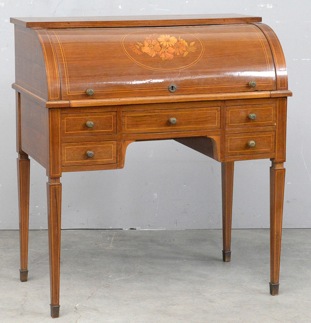 Scrittoio a rullo in stile Luigi XVI con cassettini decorato con filettature e intarsio floreale (cm 92x103x55) (difetti)