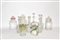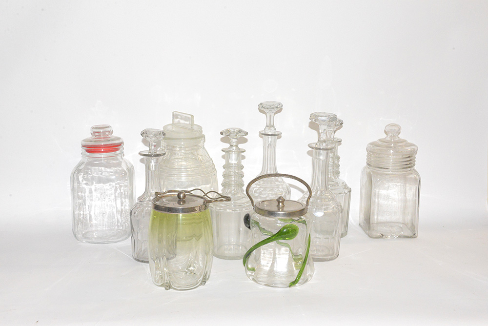 Lotto di vetri composto da cinque bottiglie con tappo e cinque contenitori con coperchi, di cui due in metallo (difetti)