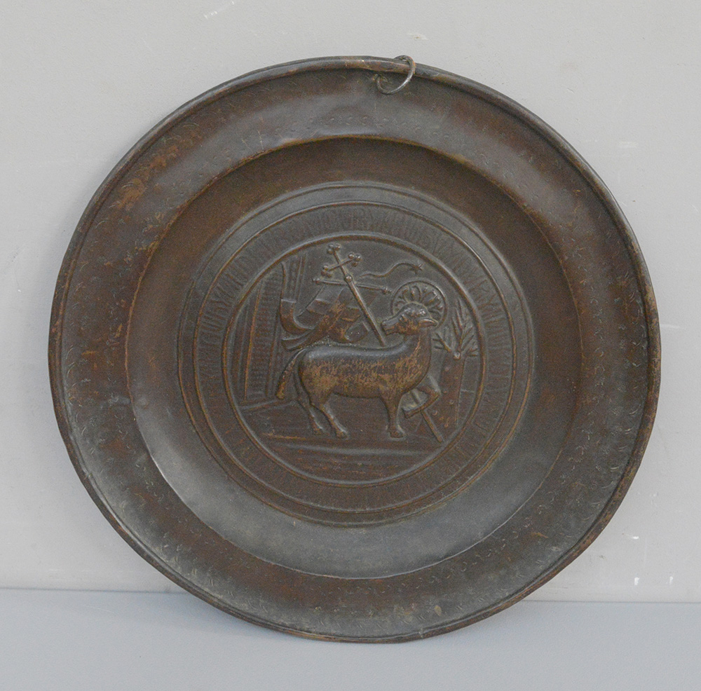 Antico elemosiniere in rame sbalzato con simboli religiosi (d cm 42) (difetti)